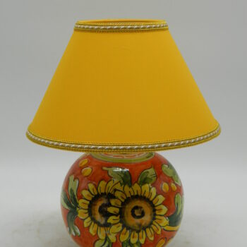 Lume modello a palla dipinto a mano decoro margherita bianca a 3 colori blu,verde e bordeaux, completo di paralume in tessuto lavabile blu e passamaneria oro e blu