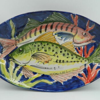 Piatto OVALE in ceramica decorato con fiore bianco e fondo blu antico