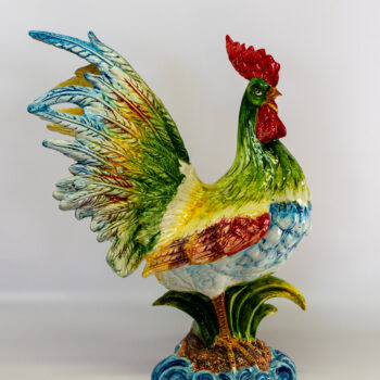 Pappagallo in ceramica , poggiato su tronco, dipinto rigorosamente a mano