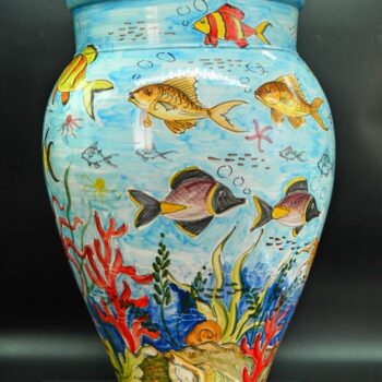 Portaombrello modello a giara color panna,impreziosito da intaglio realizzato a mano sul bordo .